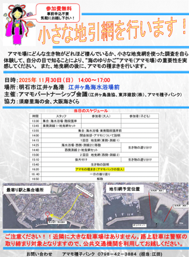 明石市江井ヶ島海岸で小さな地曳網によるアマモ場の生物調査(冬季)を以下のとおり行います。